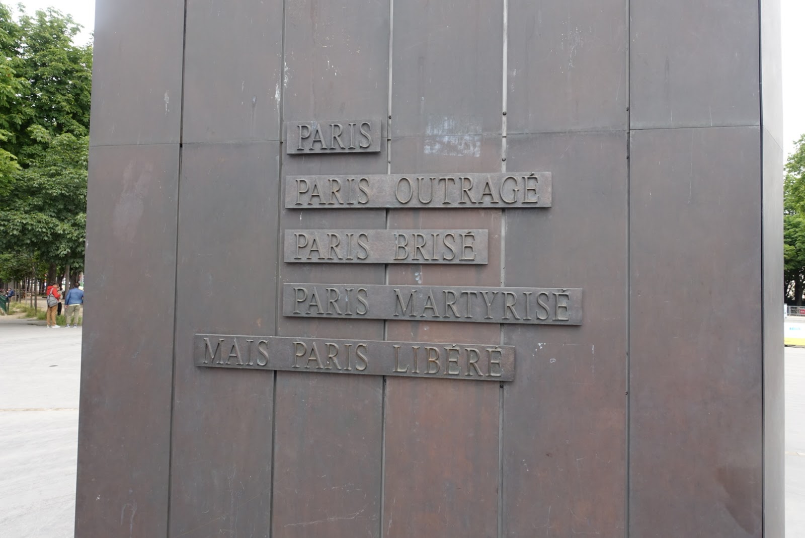 | Inscription on the Charles de Gaule monument: Paris, Paris Outraged, Paris Broken, Paris Martyred, but Paris is Free |